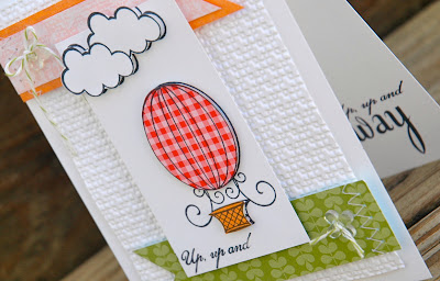 Keeping my card clean and simple is definitely a challenge for me! I managed to keep lots of white space with an embossed white background and just a hint of color with the flags and hot air balloon. After a little stamping and paper piecing of the image panel, a little stitching of the flags, and a little tying of buttons...my card was complete! Fun card to make:)